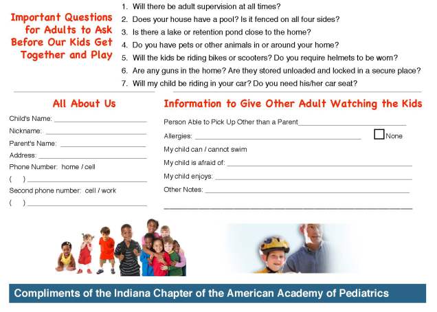Playdate safety cards are meant to help parents ask each other about potential safety hazards in the environment in which children play. It is hard to ask someone if they have guns in the home, and even more so of friends or acquaintances you have known for a while but may have never thought to ask. These playdates cards can help start the conversation.